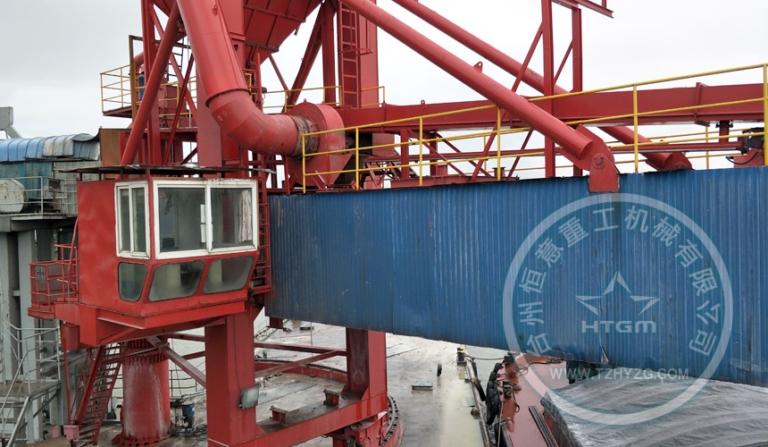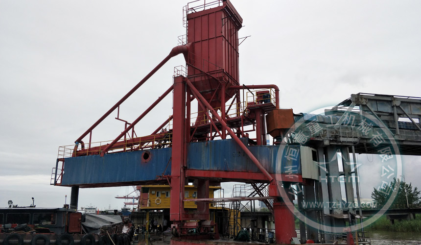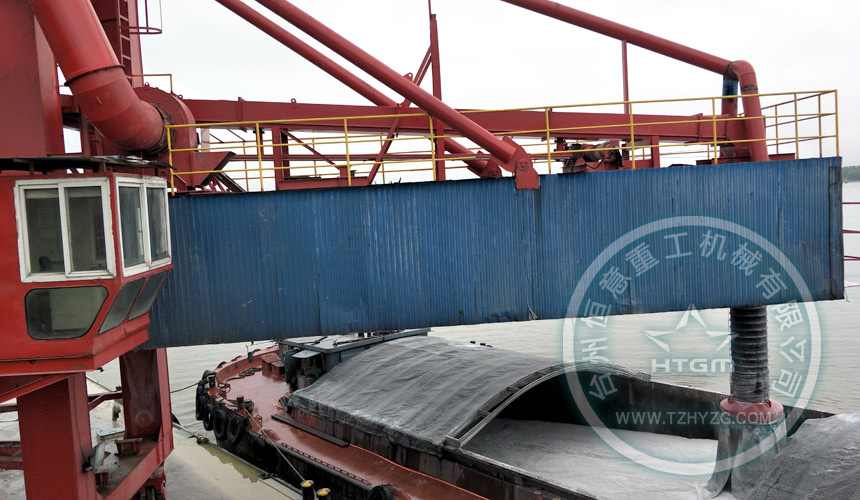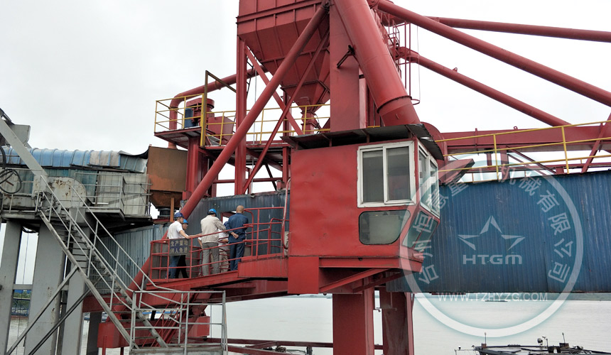 馬鞍山港碼頭,后場450t/h礦粉生產線,通過300米密封式皮帶機給到布置在駁船上的一臺500t/h礦粉弧形軌道裝船機。通過本次老舊設備改造,為業主徹底解決環保不達標停產問題。做到無揚塵、環保、節能、高效。